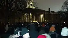 Later that evening, however, the board of trustees voted to terminate Paterno's contract, effective immediately.[2][79] They considered but ultimately rejected the idea of letting Paterno finish out the season, saying that growing outrage at the situation would have made it impossible for him to be effective as coach.[2][80][81] Unable to reach Paterno personally due to the crowd around his house and not wanting Paterno to find out through the media, the board notified him of their decision over the telephone.[82][83] Tom Bradley, Sandusky's successor as defensive coordinator, was named interim head coach for the remainder of the 2011 season. At the same meeting, university president Graham Spanier resigned rather than face being fired as well.[84][85][86][87] That night, several thousand Penn State students chanting Paterno's name rioted in the streets, hurling rocks, tearing down street signs, and overturning a news van.[88]