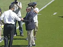 On May 16, 2006, Paterno was elected to the College Football Hall of Fame after the National Football Foundation decided to change its rules and allow any coach over the age of 75 to be eligible for the Hall of Fame instead of having to wait until retirement.[42] However, on November 4, 2006, he was injured during a sideline collision during a game against Wisconsin. As a result of his injuries, he was unable to travel to the induction ceremonies in New York City and the National Football Foundation announced that he would instead be inducted as a part of the Hall of Fame class of 2007.[43] Paterno was inducted on December 4, 2007,[44] and officially enshrined in a ceremony held July 19, 2008.[45]