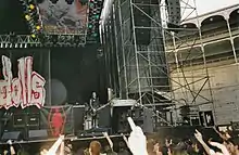 While touring Ozzfest in 2001 to support Slipknot's studio album Iowa, Jordison met Tripp Eisen, then of Static-X; the two discussed forming a side project.[30] In 2002, Jordison revived his band The Rejects, renaming them the Murderdolls.[31] Jordison became the Murderdolls' guitarist, and he recruited Wednesday 13 of Frankenstein Drag Queens from Planet 13 to play bass. Wednesday eventually became a vocalist, while drummer Ben Graves and bassist Eric Griffin completed the band's lineup.[32] Murderdolls signed with Roadrunner Records and released an EP entitled Right to Remain Violent in 2002. The band returned in August 2002 with their debut album Beyond the Valley of the Murderdolls.[33] The band uses horror films, including Friday the 13th and Night of the Living Dead, as an inspiration for their lyrics.[34] On October 30, 2002, the Murderdolls made an appearance on an episode of Dawson's Creek entitled "Living Dead Girl".[35] The band reunited in 2010 with only Jordison and Wednesday 13 remaining from the original line-up.[36] The band released their second studio album Women & Children Last on August 31, 2010.[37] The band embarked on the extensive Women & Children Last World Tour performing shows alongside many notable acts such as Guns N' Roses and performing around the world. The tour was plagued with many problems including the cancellation of many shows and repeated incidents of Jordison storming off stage, most notably in Bordeaux, France (attributed to extreme tinnitus[38]) and Perth, Western Australia. The tour finished on April 24, 2011. This was considered to be the band's last outing as Wednesday 13 confirmed the band's split in an interview in March 2013.