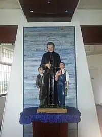 When Bosco was little more than two years old, his father died, which left the support of three boys to his mother.[3] She played a strong role in Bosco's formation and personality,[17] and was an early supporter of her son's ideals.[18] In 1825, when he was nine, Bosco had the first of a series of dreams that would play an influential role in his outlook and work. This first dream "left a profound impression on him for the rest of his life" according to his own memoirs.[19] Bosco apparently saw a multitude of very poor boys playing and blaspheming, and a man, who "appeared, nobly attired, with a manly and imposing bearing",[19] and said to him, "You will have to win these friends of yours not with blows, but with gentleness and kindness. So begin right now to show them that sin is ugly and virtue beautiful."[19]