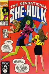 On the request of editor Mark Gruenwald, Byrne wrote and drew a new series in 1989, The Sensational She-Hulk (maintaining the 1985 graphic novel's title). Gruenwald directed that it be significantly different from the character's previous series, The Savage She-Hulk.[75] Byrne's take was comedic and the She-Hulk, who was aware she was in a comic book, regularly broke the fourth wall, developing a love-hate relationship with her artist/writer by criticizing his storylines, drawing style, character development, etc.[76] Byrne left the book after writing and drawing the first eight issues. Byrne was asked for input on writer Dwayne McDuffie's She-Hulk: Ceremony limited series, and according to Byrne, most of his objections to the story and notations of errors were ignored, and his editor, Bobbie Chase, "was rewriting my stuff to bring it into line with" the story in Ceremony. Upon complaining to DeFalco, Byrne says he was fired from his series.[75] He later returned to write and draw issues #31–50 under new editor Renée Witterstaetter.[16]