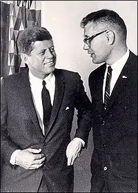 Dingell was generally classified as a moderately liberal member of the Democratic Party.[21] Throughout his career he was a leading congressional supporter of organized labor, social welfare measures and traditional progressive policies. At the beginning of every Congress, Dingell introduced a bill providing for a national health insurance system, the same bill that his father proposed while he was in Congress. Dingell also strongly supported Bill Clinton's managed-care proposal early in his administration.[21] In October 1998, President Clinton began a Roosevelt Room appearance "by thanking Senator Jay Rockefeller of West Virginia and Congressman Dingell for their steadfast support of Medicare and their participation in our Medicare Commission."[22]