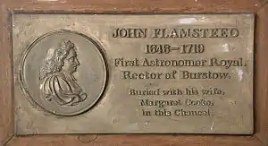 The will of Flamsteed's widow, Margaret, left instructions for her own remains to be deposited "in the same Grave in which Mr John Flamsteed is buryed in the Chancell of Burstow Church". She also left instructions, and twenty five pounds, for the executor of her will to place "in the aforesaid Chancell of Burstow … A Marble stone or Monument, with an inscription in Latin, in memory of the late Reverend Mr. John Flamsteed". It seems no such monument was created, and almost 200 years later, a plaque was placed to mark his burial in the chancel.[8]