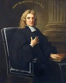 John Flamsteed FRS (19 August 1646 – 31 December 1719)[lower-alpha 1] was an English astronomer and the first Astronomer Royal. His main achievements were the preparation of a 3,000-star catalogue, Catalogus Britannicus, and a star atlas called Atlas Coelestis, both published posthumously. He also made the first recorded observations of Uranus, although he mistakenly catalogued it as a star, and he laid the foundation stone for the Royal Greenwich Observatory.