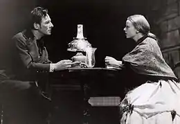 In late 1945 and early 1946 Gielgud toured for ENSA in the Middle and Far East with Hamlet and Coward's Blithe Spirit. During this tour he played Hamlet on stage for the last time.[29] He was Raskolnikoff in a stage version of Crime and Punishment, in the West End in 1946 and on Broadway the following year.[29] Agate thought it the best thing Gielgud had done so far, other than Hamlet.[120] Between these two engagements Gielgud toured North America in The Importance of Being Earnest and Love for Love. Edith Evans was tired of the role of Lady Bracknell, and refused to join him; Margaret Rutherford played the part to great acclaim.[121] Gielgud was in demand as a director, with six productions in 1948–49. They included The Heiress in 1949, when he was brought in at the last moment to direct Richardson and Ashcroft, saving what seemed a doomed production; it ran for 644 performances.[122] His last big hit of the 1940s was as Thomas Mendip in The Lady's Not for Burning, which he also directed. The London cast included the young Claire Bloom and Richard Burton, who went with Gielgud when he took the piece to the US the following year.[123]