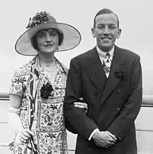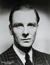 Returning to the West End, Gielgud starred in J. B. Priestley's The Good Companions, adapted for the stage by the author and Edward Knoblock.[n 6] The production ran from May 1931 for 331 performances, and Gielgud described it as his first real taste of commercial success.[68] He played Inigo Jollifant, a young schoolmaster who abandons teaching to join a travelling theatre troupe. This crowd-pleaser drew disapproval from the more austere reviewers, who felt Gielgud should be doing something more demanding,[69] but he found playing a conventional juvenile lead had challenges of its own and helped him improve his technique.[70] During the run of the play he made another film, Insult (1932), a melodrama about the French Foreign Legion, and he starred in a cinema version of The Good Companions in 1933, with Jessie Matthews.[29][n 7] A letter to a friend reveals Gielgud's view of film acting: "There is talk of my doing Inigo in the film of The Good Companions, which appals my soul but appeals to my pocket."[73] In his first volume of memoirs, published in 1939, Gielgud devoted two pages to describing the things about filming that he detested.[74] Unlike his contemporaries Richardson and Laurence Olivier, he made few films until after the Second World War, and did not establish himself as a prominent film actor until many years after that.[75] As he put it in 1994, "I was stupid enough to toss my head and stick to the stage while watching Larry and Ralph sign lucrative Korda contracts."[76]