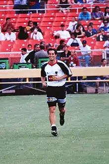 John Harkes played in the 1990 and 1994 FIFA World Cup Harkes made his national team debut on March 23, 1987, against Canada. He was on the U.S. team at the 1987 Pan American Games.[11] He quickly established himself as a national team regular and was selected for the 1988 Olympics. That year the U.S. went 1–1–1 and failed to qualify for the second round. Harkes continued to play for the national team as it went through the qualification process for the upcoming World Cup. The team qualified for those games after an improbable 1–0 road victory over Trinidad and Tobago in the final qualification match.