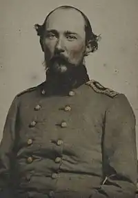 The state Democratic Convention met on February 22, 1867, in Frankfort and chose Helm and John W. Stevenson as the party's candidates for governor and lieutenant governor, respectively.[40] Helm resigned his seat in the state senate to accept the nomination.[18] Though his health was frail, he determined to canvass the entire state.[41] He continued his call for an end to Civil War bitterness and proscriptions against those who had sided with the Confederacy.[18] He won the general election over Republican Sidney Barnes and a third party candidate, Judge William B. Kinkead.[18]