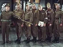 In September 1940 Le Mesurier's rented home was hit by a German bomb, destroying all his possessions, including his call-up papers.[35] In the same bombing raid, the theatre in Brixton in which he was working was also hit.[36] A few days later he reported for basic training with the Royal Armoured Corps;[37] in June 1941 he was commissioned into the Royal Tank Regiment.[38] He served in Britain until 1943 when he was posted to British India where he spent the rest of the war.[14] Le Mesurier later claimed that he had had "a comfortable war, with captaincy thrust upon me, before I was demobbed in 1946".[39]