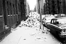 That same year, 1968, also saw a three-day Broadway strike and a nine-day sanitation strike.[20] Quality of life in the city reached a nadir during the sanitation strike as mounds of garbage caught fire and strong winds blew the filth through the streets.[21] In June 1968, the New York City Police Department deployed snipers to protect Lindsay during a public ceremony, shortly after they detained a knife-wielding man who had demanded to meet the mayor.[22] With the schools shut down, police engaged in a slowdown, firefighters threatening job actions, the city awash in garbage, and racial and religious tensions breaking to the surface, Lindsay later called the last six months of 1968 "the worst of my public life."[1]