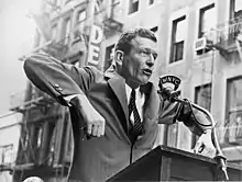 In 1965, Lindsay was elected Mayor of New York City as a Republican with the support of the Liberal Party of New York in a three-way race. He defeated Democratic mayoral candidate Abraham D. Beame, then City Comptroller, as well as National Review founder William F. Buckley, Jr., who ran on the Conservative line. The unofficial motto of the campaign, taken from a Murray Kempton column, was "He is fresh and everyone else is tired".[2][15]