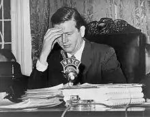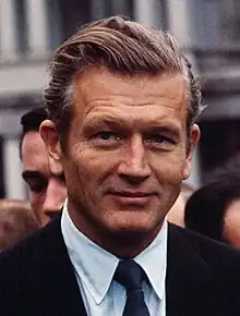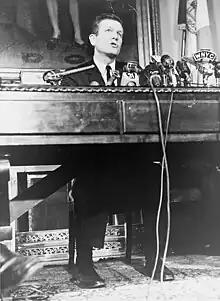 Lindsay was mentioned as a Republican Vice-Presidential possibility in 1968, but was found to be unacceptable by Southern conservatives, and Spiro Agnew was nominated instead. Lindsay’s original break with the Republican Party began immediately after he failed to win the 1969 Republican mayoral Primary, and his subsequent association with the New York Liberal Party for that election. In 1971, Lindsay and his wife cut ties with the Republican Party by registering with the Democratic Party. Lindsay said, "In a sense, this step recognizes the failure of 20 years in progressive Republican politics. In another sense, it represents the renewed decision to fight for new national leadership."[52] Lindsay then launched a brief and unsuccessful bid for the 1972 Democratic presidential nomination. He attracted positive media attention and was a successful fundraiser. Lindsay did well in the early Arizona caucus, coming in second place[53] behind Edmund Muskie of Maine and ahead of eventual nominee George McGovern of South Dakota. Then in the March 14 Florida primary, he placed a weak fifth place, behind George Wallace of Alabama, Muskie, Hubert Humphrey of Minnesota, and Scoop Jackson of Washington (though he did edge out McGovern).[54] Among his difficulties was New York City's worsening problems, which Lindsay was accused of neglecting; a band of protesters from Forest Hills, Queens, who were opposed to his support for a low income housing project in their neighborhood, followed Lindsay around his aborted campaign itinerary to jeer and heckle him.[55][56] His poor showing in Florida effectively doomed his candidacy. Shortly thereafter, influential Brooklyn Democratic Party chairman Meade Esposito called for Lindsay to end his campaign: "I think the handwriting is on the wall; Little Sheba better come home."[57] After a poor showing in the April 5 Wisconsin primary, Lindsay formally abandoned the race.