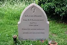 Peel's funeral, on 12 November 2004, in Bury St Edmunds, Suffolk, was attended by over a thousand people, including many of the artists he had championed. Eulogies were read by his brother Alan Ravenscroft and DJ Paul Gambaccini. The service ended with clips of him talking about his life. His coffin was carried out to the accompaniment of his favourite song, The Undertones' "Teenage Kicks".[41] Peel had written that, apart from his name, all he wanted on his gravestone were the words, "Teenage dreams, so hard to beat", from the lyrics of "Teenage Kicks".[42] A headstone featuring the lyrics and the Liver Bird from his favourite football team, Liverpool F.C., was placed at his grave in 2008.[43] Peel was buried in the graveyard of St Andrew's Church in Great Finborough, Suffolk.
