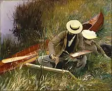 Sargent's friends and supporters included Henry James, Isabella Stewart Gardner (who commissioned and purchased works from Sargent and sought his advice on other acquisitions),[109] Edward VII,[110] and Paul César Helleu. His associations also included Prince Edmond de Polignac and Count Robert de Montesquiou. Other artists Sargent associated with were Dennis Miller Bunker, James Carroll Beckwith, Edwin Austin Abbey, and John Elliott (who also worked on the Boston Public Library murals), Francis David Millet, Joaquín Sorolla, and Claude Monet, whom Sargent painted. Between 1905 and 1914, Sargent's frequent traveling companions were the married artist couple Wilfrid de Glehn and Jane Emmet de Glehn. The trio would often spend summers in France, Spain, or Italy, and all three would depict one another in their paintings during their travels.[111]
