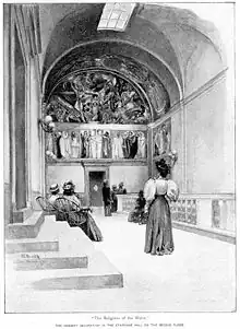 Sargent worked on the murals from 1895 through 1919; they were intended to show religion's (and society's) progress from pagan superstition up through the ascension of Christianity, concluding with a painting depicting Jesus delivering the Sermon on the Mount. But Sargent's paintings of "The Church" and "The Synagogue", installed in late 1919, inspired a debate about whether the artist had represented Judaism in a stereotypical, or even an anti-Semitic, manner.[91] Drawing upon iconography that was used in medieval paintings, Sargent portrayed Judaism and the synagogue as a blind, ugly hag, and Christianity and the church as a lovely, radiant young woman. He also failed to understand how these representations might be problematic for the Jews of Boston; he was both surprised and hurt when the paintings were criticized.[92] The paintings were objectionable to Boston Jews since they seemed to show Judaism defeated, and Christianity triumphant.[93] The Boston newspapers also followed the controversy, noting that while many found the paintings offensive, not everyone agreed. In the end, Sargent abandoned his plan to finish the murals, and the controversy eventually died down.