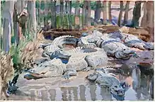 Sargent's fame was still considerable and museums eagerly bought his works. That year he declined a knighthood and decided instead to keep his American citizenship. From 1907[75] on, Sargent largely forsook portrait painting and focused on landscapes. He made numerous visits to the United States in the last decade of his life, including a stay of two full years from 1915 to 1917.[76] In April 1917 Sargent was visiting the Miami estate of James Deering and was invited to cruise the Florida Keys with James and his brother Charles Deering aboard James' yacht Nepenthe. Sargent was much more interested in the "mine of sketching" that was the estate, not at all interested in fishing, and made the cruise "reluctantly," doing some watercolor sketches (including Derelicts, 1917).[77]