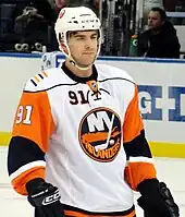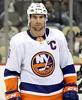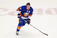 On September 9, 2013, Tavares was named as the 14th captain in New York Islanders history, replacing former Islander Mark Streit of the Philadelphia Flyers, who served as team captain since 2011.[49] On February 19, 2014, during the 2014 Winter Olympics, Tavares suffered a torn medial collateral ligament (MCL) and a torn meniscus in his knee during the quarterfinal game against Latvia, forcing him to miss the remainder of the Olympics as well as the remainder of the 2013-14 Islanders' season. At the time of his injury, Tavares ranked third in the NHL with 24 goals, 42 assists and 66 points in 59 games.[50] The following season, he was selected for the 2015 NHL All-Star Game, along with teammate Jaroslav Halák.[51] Tavares finished the 2014–15 NHL season as runner up for the Art Ross Trophy with 86 points, one point behind the recipient, Dallas Stars forward Jamie Benn.[52] Additionally, Tavares was named a finalist for the Hart Memorial Trophy for the second time in his career; ultimately ceding the award to Carey Price.