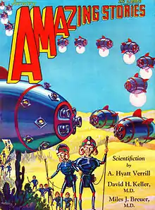 Editor T. O'Conor Sloane lost Campbell's first manuscript that he accepted for Amazing Stories, entitled "Invaders of the Infinite".[2] "When the Atoms Failed" appeared in January 1930, followed by five more during 1930. Three were part of a space opera series featuring the characters Arcot, Morey, and Wade. A complete novel in the series, Islands of Space, was the cover story in the Spring 1931 Quarterly.[12] During 1934–35 a serial novel, The Mightiest Machine, ran in Astounding Stories, edited by F. Orlin Tremaine, and several stories featuring lead characters Penton and Blake appeared from late 1936 in Thrilling Wonder Stories, edited by Mort Weisinger.[12]