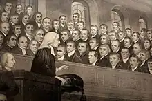 Wesley was unhappy about the idea of field preaching as he believed Anglican liturgy had much to offer in its practice. Earlier in his life he would have thought that such a method of saving souls was "almost a sin."[48] He recognised the open-air services were successful in reaching men and women who would not enter most churches. From then on he took the opportunities to preach wherever an assembly could be brought together, more than once using his father's tombstone at Epworth as a pulpit.[49][50] Wesley preached to create repentance, prayed for conversion, dealt with hysterical behavior, and preached to upwards of thousands through field preaching.[45] Wesley continued for fifty years—entering churches when he was invited, and taking his stand in the fields, in halls, cottages, and chapels, when the churches would not receive him.[49]