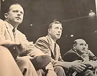 After college, Wooden spent several years playing professional basketball in the NBL with the Indianapolis Kautskys, Whiting Ciesar All-Americans, and Hammond Ciesar All-Americans,[18][19][20] while he taught and coached in the high school ranks.[19] During one 46-game stretch, he made 134 consecutive free throws.[18] He was named to the All-NBL First Team for the 1937–38 season.[20]