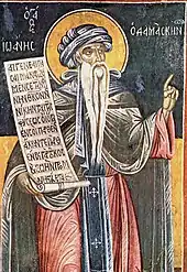 The tribal background of Mansur ibn Sarjun, John's grandfather, is unknown, but biographer Daniel Sahas has speculated that the name Mansur could have implied descent from the Arab Christian tribes of Kalb or Taghlib.[18] The name was common among Syrian Christians of Arab origins, and Eutychius noted that the governor of Damascus, who was likely Mansur ibn Sarjun, was an Arab.[18] However, Sahas also asserts that the name does not necessarily imply an Arab background and could have been used by non-Arab, Semitic Syrians.[18] While Sahas and biographers F. H. Chase and Andrew Louth assert that Mansūr was an Arabic name, Raymond le Coz asserts that the "family was without doubt of Syrian origin";[19] indeed, according to historian Daniel J. Janosik, "Both aspects could be true, for if his family ancestry were indeed Syrian, his grandfather [Mansur] could have been given an Arabic name when the Arabs took over the government."[20] When Syria was conquered by the Muslim Arabs in the 630s, the court at Damascus retained its large complement of Christian civil servants, John's grandfather among them.[15][17] John's father, Sarjun (Sergius), went on to serve the Umayyad caliphs.[15] John of Jerusalem claims that he also served as a senior official in the fiscal administration of the Umayyad Caliphate under Abd al-Malik before leaving Damascus and his position around 705 to go to Jerusalem and become a monk. However, this point is debated within the academic community as there is no trace of him in the Umayyad archives, unlike his father and grandfather. Some researchers, such as Robert G. Hoyland,[21] deny such an affiliation, while others, like Daniel Sahas or the Orthodox historian Jean Meyendorff, suppose that he might have been a lower-level tax administrator, a local tax collector who would not have needed to be mentioned in the archives, but who might not have necessarily been part of the court either.[22][23] In addition, John's own writings never refer to any experience in a Muslim court. It is believed that John became a monk at Mar Saba, and that he was ordained as a priest in 735.[15][24]