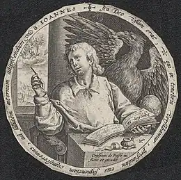 Legends from the "Acts of John" contributed much to medieval iconography; it is the source of the idea that John became an apostle at a young age.[26] One of John's familiar attributes is the chalice, often with a snake emerging from it.[34] According to one legend from the Acts of John,[35] John was challenged to drink a cup of poison to demonstrate the power of his faith, and thanks to God's aid the poison was rendered harmless.[34][36] The chalice can also be interpreted with reference to the Last Supper, or to the words of Christ to John and James: "My chalice indeed you shall drink."[37][38] According to the 1910 Catholic Encyclopedia, some authorities believe that this symbol was not adopted until the 13th century.[38] There was also a legend that John was at some stage boiled in oil and miraculously preserved.[39] Another common attribute is a book or a scroll, in reference to his writings.[34] John the Evangelist is symbolically represented by an eagle, one of the creatures envisioned by Ezekiel (1:10)[40] and in the Book of Revelation (4:7).[41][38]