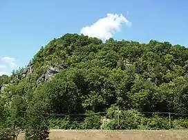 The bedrock underlying the mountain is composed of limestone and dolomite members of the Helderberg Group, laid during the Paleozoic era. Most of the Helderberg carbonates in Rosendale are located north of the Rondout Creek, and have given Rosendale a karst topography, resulting in "sink holes, disappearing streams, caves, and springs".[11] The mountain's surface is composed of unconsolidated, glacially deposited outwash and till, with several outcrops exposing Joppenbergh's bedrock.[11] Soils have been mapped as Farmington-Rock outcrop complex.[12] In some areas, the soil depth is less than 20 inches (51 cm),[11] which hinders groundwater filtration. Other parts of the mountain have a steep, 30 percent grade. These areas, comprising nearly 75 percent of the 117-acre (47 ha) property, cannot be easily developed.[13]