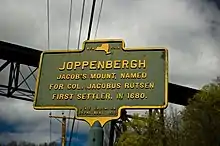 Joppenbergh is named after Colonel Jacob Rutsen, born Jacobsen Rutger van Schoonderwoerdt. Rutsen was a merchant, and the son of a Dutch immigrant, from Albany; he founded the first settlement in what is now the town of Rosendale, New York, in the late 17th century.[2][3] The spelling of the mountain's name has been disputed,[4] and has been rendered as Joppenberg[5] and Joppenburgh.[6] It has also been called Jacob's Nose,[7] Jacob's Mount,[2] and, in an early 18th-century deed, Jobsenbright.[8]