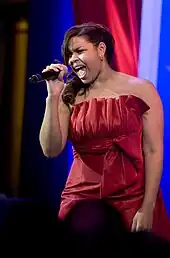 Jordin Sparks (born December 22, 1989)[1] is an American singer and actress. She rose to fame in 2007 after winning the sixth season of American Idol at age 17, becoming the youngest winner in the series' history. Her self-titled debut studio album, released later that year, was certified platinum by the Recording Industry Association of America (RIAA) and has sold over two million copies worldwide.[2] The album spawned the Billboard Hot 100 top-ten singles "Tattoo" and "No Air"; the latter, a collaboration with Chris Brown, is currently the third highest-selling single by any American Idol contestant, selling over three million digital copies in the United States.[3] The song earned Sparks her first Grammy Award nomination for Best Pop Collaboration with Vocals.[4]