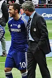 After two years at Porto, the duo moved again, joining Barcelona in 1996.[29] Mourinho and his family moved to the city of Barcelona, and he gradually became a prominent figure of the club's staff by translating at press conferences, planning practice sessions and helping players through tactical advice and analyses of the opposition. Robson and Mourinho's styles complemented each other: the Englishman favoured an attacking style, while Mourinho covered defensive options, and the Portuguese's love of planning and training combined with Robson's direct man-management. The Barcelona attack was led by a prime Ronaldo – whom Mourinho regards as the best player post-Diego Maradona.[30] The partnership was fruitful and Barcelona finished the season by winning the European Cup Winners' Cup, the Copa del Rey and Supercopa de España.[31] Robson moved clubs the following season but this time Mourinho did not follow as Barcelona were keen to retain him as assistant manager.[27] The two remained good friends and Mourinho later reflected on the effect Robson had had upon him: