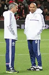 Mourinho began discussing tactics and coaching with Robson in his interpreting role.[25] Robson was sacked by the club in December 1993. When Porto appointed him as their head coach, Mourinho moved with him, continuing to coach and interpret for players at the new club.[27] The Porto team, consisting of players like Ljubinko Drulović, Domingos, Rui Barros, Jorge Costa and Vítor Baía, went on to dominate Portuguese football the following years. With Robson as head coach and Mourinho as his assistant, Porto reached the 1993–94 UEFA Champions League semi-finals and won the 1993–94 Taça de Portugal, the 1994–95 and 1995–96 Portuguese championship, and the 1994, 1995 and 1996 Portuguese Super Cup, the latter with a 5–0 victory over arch-rivals Benfica, in what proved to be Robson's last game at Porto before moving to Barcelona, earning Robson the nickname "Bobby Five-O" in Portugal.