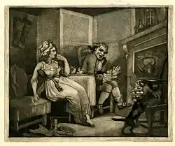 The Sadler's Wells season commenced at Easter 1805, and Grimaldi and Jack Bologna enjoyed a successful period. Drury Lane staged the opera Lodoiska, in which Grimaldi, his mother and his wife all had starring roles.[91] After this he was asked to choreograph John Tobin's play, The Honey Moon, at Drury Lane on short notice. He accepted on the proviso that his wages be increased for the show's entire run and not just until a new dancing instructor was found. The Drury Lane management agreed to pay Grimaldi £2 more per week.[92] A few weeks into his new assignment, management appointed James D'Egville as the new ballet master. D'Egville's debut production was Terpsichore's Return, in which Grimaldi played Pan, a role which he considered to be one of his best assignments to date.[93] That October, however, the theatre reduced his wages. The extra £2 that he had been promised had been deducted from his salary when Terpsichore closed, and he approached Thomas Dibdin for advice. Dibdin advised him to leave Drury Lane and to take up a residency at the nearby Covent Garden Theatre.[94] Grimaldi wrote to Thomas Harris, the manager of the Covent Garden Theatre, hoping to persuade him to stage Christmas pantomimes. Harris was already a supporter of the shows and had employed the writing talents of both Charles Dibdin and his co-writer Charles Farley.[95] Grimaldi met with Harris and obtained a contract.[96] Before joining that theatre, however, he had to satisfy prior commitments at Drury Lane, appearing in the poorly received Harlequin's Fireside.[91]