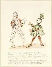 Grimaldi and Dubois appeared together again later that spring at Sadler's Wells in Dibdin's Harlequin Alchemist, which set up a mock duel between the two Clowns, with the audience deciding who could pull the most hideous face. Grimaldi consistently won.[62] In the next piece, Harlequin Benedick; or, The Ghost of Mother Shipton. Dubois was relegated to the role of Pierrot, while Grimaldi played Clown. Grimaldi's mother was in the cast, appearing as the Butcher's Wife. He then appeared in another Dibdin play, The Great Devil.[67] During the run, he accidentally injured himself on stage by shooting himself in the foot[68] and was confined to bed for five weeks.[69] His mother became so concerned at her son's fragile and still grief-stricken state that she employed a dancer at Drury Lane, Mary Bristow, to care for him full-time during those weeks. They formed a close friendship, which resulted in a loving relationship,[70] and they married on 24 December 1801.[71][72]
