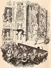 Although officially retired, Grimaldi still received half of his former small salary from Drury Lane until 1824. Soon after the fee stopped, Grimaldi fell into poverty after a number of ill-conceived business ventures and because he had entrusted management of his provincial earnings to people who cheated him.[155] Despite his disabilities, he offered his services as a cameo performer in Christmas pantomimes. Along with Bologna, in 1827 he re-appeared briefly at Sadler's Wells where he gave some acting instruction to the mime artist William Payne, the future father of the Payne Brothers.[156] He also started working for Richard Brinsley Peake, namesake of Richard Brinsley Sheridan,[157] who was the dramaturge at the English Opera House. Peake hired Grimaldi to star in Monkey Island alongside his son JS. However, Grimaldi's health deteriorated further and he was forced to quit before the show opened; his scene was cut.[158] The early end to his career, worries about money, and the uncertainty over his son's future made him increasingly depressed.[48] To make light of it, he would often joke about his condition: "I make you laugh at night but am Grim-all-day".[159] In 1828, two "farewell" benefit performances were held for him. In the first, he appeared as Hock the German soldier and a drunken sailor in Thomas Dibdin's melodrama The Sixes; or, The Fiends at Sadler's Wells to an audience of 2,000 people.[160] Unable to stand for long periods of time, he sang a duet with JS and finished the evening with a scene from Mother Goose.[161] His last farewell benefit performance on 27 June 1828 was at Drury Lane.[162] Between 1828 and 1836, Grimaldi relied on charity benefits to replace his lost income.[163]