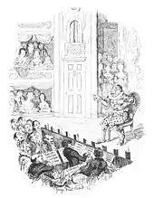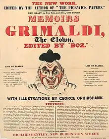 After Grimaldi's death, Charles Dickens was invited by Richard Bentley to edit and improve Thomas Egerton Wilks's clumsily written life of Grimaldi, which had been based on the clown's own notes, which Dickens did under his regular nom de plume, "Boz". As a child, Dickens saw Grimaldi perform at the Star Theatre, Rochester, in 1820.[181] The Memoirs of Joseph Grimaldi, illustrated by George Cruikshank, sold well, to Dickens's surprise.[182][n 19]