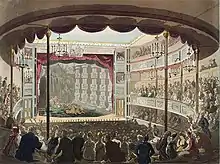 In September 1808, a fire at the Covent Garden theatre destroyed much of the Mother Goose scenery; the production transferred to the Haymarket Theatre where it completed its run. While Kemble and Harris raised funds and renovated Covent Garden, Grimaldi made provincial appearances in Manchester and Liverpool. The Covent Garden theatre re-opened in December 1809 with a revival of Mother Goose.[116] In an attempt to recover the costs incurred by the rebuilding, Kemble raised the theatre's seat prices, causing audiences to protest violently for more than two months, and the management was forced to reinstate the old prices.[117] Grimaldi's 1809–10 productions included Don Juan, in which he appeared as Scaramouche, and Castles in the Air, as Clown.[118] Later in 1810, he appeared in Birmingham in a benefit performance in aid of his sister-in-law.[119] The following year, Grimaldi sang "Tippitywitchet" for the first time at Sadler's Wells in Charles Dibdin's pantomime Bang up, or, Harlequin Prime; it became one of his most popular songs.[1][n 12]