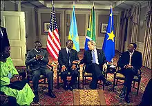 Kabila rose to the presidency on 26 January 2001 after the assassination of Laurent-Désiré Kabila, becoming the world's first head of government born in the 1970s.[13] Aged 29, he was considered young and inexperienced. He subsequently attempted to end the ongoing civil war by negotiating peace agreements with rebel groups backed by Rwanda and Uganda, the same regional armies who had brought Laurent-Désiré Kabila's rebel group to power three years before. The 2002 peace agreement signed at the Inter-Congolese Dialogue in Sun City, South Africa, which nominally ended the Second Congo War, maintained Joseph Kabila as President and head of state of the Congo. An interim administration was set up under him, including the leaders of the country's two main rebel groups as vice-presidents (two other vice-presidents were representatives of the civilian opposition and government supporters respectively). On 28 March 2004, an apparent coup attempt or mutiny around the capital Kinshasa, allegedly by members of the former guard of former president Mobutu Sese Seko (who had been ousted by Kabila's father in 1997 and died in the same year), failed.[14] On 11 June 2004, coup plotters led by Major Eric Lenge allegedly attempted to take power and announced on state radio that the transitional government was suspended, but were defeated by loyalist troops.[15][16]