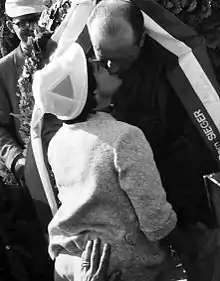 Fangio was never married, but he was involved in a romantic relationship with Andrea Berruet, with whom he broke up in 1960.[43] They had a son named Oscar 'Cacho' Espinosa (1938) who was acknowledged as the unrecognised son of Fangio in 2000.[44] Five years later, in 2005, Rubén Vázquez (1942) also claimed to be the son of Fangio through a relationship with Catarina Basili, whom Fangio had dated during a brief separation from Berruet. In July 2015, an Argentine court ruling ordered exhumation of Fangio's body after Espinosa's and Vázquez's claims to be the unacknowledged sons of the former race car driver.[45] In December 2015, the Court confirmed that Espinosa was indeed Fangio's son,[46] and in February 2016, it was confirmed that Rubén Vázquez was also Fangio's son.[47] In June 2016, a DNA analysis concluded that Juan Carlos Rodríguez (1945) was the brother of Espinosa on paternal side with a 97.5% certainty. He was born from another brief relationship with Susana Rodríguez, who was 16 years old at the time. Fangio's paternity was ratified in May 2021 with a 99.9997% probability.[48]