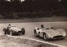 For 1955, Fangio subjected himself to a training programme which was strenuous in an effort to keep up his fitness levels high which was comparable to his younger rivals. He won a particularly brutal race at the Gran Premio de la República Argentina. This race was run in Buenos Aires during a gruelling 40 °C (104 °F) heat wave, and with track temperature of over 57 °C (135 °F) few drivers other than Fangio were able to complete the race. The W196's chassis had heated up and Fangio's right leg rubbed against the chassis structure, but even after receiving severe burns he kept going; it took him three months to recover from his injuries. 1955 also saw Fangio attempt the Mille Miglia again, this time without a navigator, driving a Mercedes-Benz 300 SLR. After leaving at 6:58 a.m., the car's advanced engine began developing problems when he got to Pescara. The Mercedes mechanics apparently found nothing, and sent him off. Fangio was losing time to Moss and Hans Herrmann, and when he got to Rome the engine was still not running smoothly. Again Fangio was sent away by the mechanics. And when he got to Florence, a few loud bangs were heard, so the mechanics raised the bonnet and they found that one of the fuel injection pipes had broken, so Fangio's 300 SLR was running on seven cylinders instead of eight; this could not be repaired and Fangio drove all the way back to Brescia with a misfiring engine, finishing in 2nd behind Moss. Fangio later surmised that Mercedes felt he could not win the race without a navigator so they did not put as much effort behind preparing his car as they did with the car of Moss, who had a navigator. At the end of the second successful season (which was overshadowed by the 1955 Le Mans disaster in which 83 spectators were killed, an accident which happened right in front of and nearly killed him) Mercedes withdrew from racing and after four attempts, Fangio never raced at Le Mans again. [23][18] A number of races were cancelled after this race except for Britain and Italy (which both already had circuits with new and updated safety facilities), which he finished in second in the former and won the latter, allowing him to win his third world championship. Mercedes's last race was the Targa Florio sportscar race, which Mercedes needed to win in order to beat Ferrari and Jaguar to the title; the German firm had skipped the first two races in Buenos Aires and Sebring, Florida. Fangio, driving with Kling finished second to Moss and Peter Collins, allowing Mercedes to win the title by two points over Ferrari.