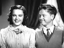 MGM hit on a winning formula when it paired Garland with Mickey Rooney in a string of what were known as "backyard musicals".[36] The duo first appeared together as supporting characters in the B movie Thoroughbreds Don't Cry (1937). Garland was then put in the cast of the fourth of the Hardy Family movies, Love Finds Andy Hardy (1938), as a literal girl-next-door to Rooney's character Andy Hardy, although Hardy's love interest was played by Lana Turner. They teamed as lead characters for the first time in Babes in Arms (1939), ultimately appearing in five additional films, including Hardy films Andy Hardy Meets Debutante (1940) and Life Begins for Andy Hardy (1941).