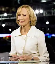 After graduating from Duke University in 1968, Woodruff entered local television news in Atlanta. She was named White House correspondent for NBC News in 1976, a position she held for six years. She joined PBS in 1982, where she continued White House reports for the PBS NewsHour, formerly The MacNeil/Lehrer NewsHour, in addition to presenting another program. She moved to CNN in 1993 to host Inside Politics and CNN WorldView together with Bernard Shaw, until he left CNN. Woodruff left CNN in 2005, and returned to PBS and the NewsHour in 2006. In 2013, she and Gwen Ifill were its named official anchors, succeeding founding presenter Jim Lehrer. Woodruff and Ifill shared managing newsgathering duties until Ifill's death in 2016. Woodruff succeeded Ifill as the program's sole main presenter.[2] In May 2022, Woodruff announced that she would step down as the NewsHour's anchor at year's end,[3][4] and her final day as anchor was on December 30, 2022.[5]