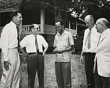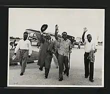 Nyerere gained many friends in Edinburgh,[82] and socialised with Nigerians and West Indians living in the city.[83] There are no reports of Nyerere experiencing racial prejudice while in Scotland; although it is possible he did encounter it, many black students in Britain at the time reported that white British students were generally less prejudiced than other sectors of the population.[84] In classes, he was generally treated as the equal of his white fellows, which gave him additional confidence,[80] and may have help mould his belief in multi-racialism.[85] During his time in Edinburgh, he may have engaged in part-time work to support himself and family in Tanganyika; he and other students went on a working holiday to a Welsh farm where they engaged in potato picking.[86] In 1951, he travelled down to London to meet with other Tanganyikan students and attend the Festival of Britain.[87] That same year, he co-wrote an article for The Student magazine in which he criticised plans to incorporate Tanganyika into the Federation of Rhodesia and Nyasaland, which he and co-author John Keto noted was designed to further white minority control in the region.[88] In February 1952, he attended a meeting on the issue of the Federation that was organised by the World Church Group; among those speaking at the meeting was the medical student—and future Malawian leader—Hastings Banda.[89] In July 1952, Nyerere graduated from the university with an Ordinary Degree of Master of Arts.[90] Leaving Edinburgh that week, he was granted a short British Council Visitorship to study educational institutions in England, basing himself in London.[91]