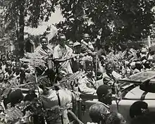 Nyerere returned to Dar es Salaam in October 1955.[116] From then until Tanzania secured independence, he toured the country almost continuously, often in TANU's Land Rover.[117] The British colonial Governor of Tanganyika, Edward Twining, disliked Nyerere, regarding him as a racialist who wanted to impose indigenous domination over the European and South Asian minorities.[118] In December 1955, Twining established the "multi-racial" United Tanganyika Party (UTP) to combat TANU's African nationalist message.[119] Nyerere nevertheless stipulated that "we are fighting against colonialism, not against the whites".[120] He befriended members of the white minority, such as Lady Marion Chesham, a U.S.-born widow of a British farmer, who served as a liaison between TANU and Twining's government.[121] A 1958 editorial in the TANU newsletter Sauti ya Tanu (Voice of TANU) that had been written by Nyerere called on the party's members to avoid participating in violence.[122] It also criticised two of the country's district commissioners, accusing one of trying to undermine TANU and another of putting a chief on trial for "cooked-up reasons". In response, the government filed three counts of criminal libel.[122] The trial took almost three months. Nyerere was found guilty, with the judge stipulating that he could either pay a £150 fine or go to prison for six months; he chose the former.[123]