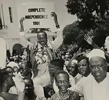 Twining announced that elections for a new legislative council would take place in early 1958. These would be organised around ten constituencies, each electing three members of the council: one indigenous African, one European, and one South Asian.[124] This would end the concentration of political representation entirely with the European minority, but still meant that the three ethnic blocs would receive equal representation despite the fact that indigenous Africans made up over 98% of the country's population.[103] For this reason, most of TANU's leadership believed that it should boycott the election.[125] Nyerere disagreed. In his view, TANU should participate and seek to secure the majority of the indigenous African representatives to advance their political leverage. If they abstained, he argued, the UTP would win the elections, TANU would be forced to operate entirely outside of government, and it would delay the process of attaining independence. At a January 1958 conference in Tabora, Nyerere convinced TANU to take part.[125] In these elections, which took place over the course of 1958 and 1959, TANU won every seat it contested.[126] Nyerere stood as TANU's candidate in the Eastern Province seat against an independent candidate, Patrick Kunambi, securing 2600 votes to Kunambi's 800.[126] Some of the European and Asian candidates elected were TANU sympathisers, ensuring that the council was dominated by the party.[127]