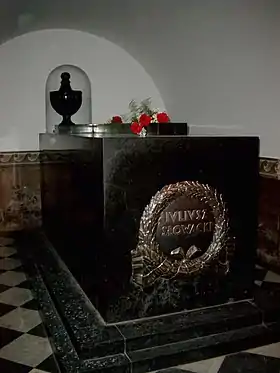 In 1927, some eight years after Poland had regained independence, the Polish government arranged for Słowacki's remains to be transferred from Paris to Wawel Cathedral, in Kraków.[1][34] He was interred in the Crypt of the National Bards, beside Mickiewicz.[34] Słowacki's interment at Waweł Cathedral was controversial, as many of his works were considered heretical by Polish Catholic-Church officials.[1][23] It took almost two decades and the backing of Józef Piłsudski, for whom Słowacki was a favorite poet, to obtain the Church's agreement to interring Słowacki at Wawel Cathedral.[1][23][34] At the 1927 ceremony, Piłsudski commanded:
