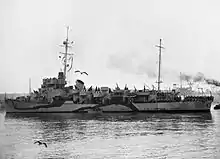 The landings would be supported by the largest invasion fleet in history – 7,016 vessels in total.[30] The Royal Canadian Navy contributed 121 vessels to the armada, including destroyers, frigates, corvettes, landing ships, minesweepers and torpedo boats.[31] Four Canadian Tribal-class destroyers were in the Royal Navy's 10th Destroyer Flotilla, which joined other RN units in keeping the English Channel near Normandy clear of German naval units.[lower-alpha 3] Naval Force J had begun intense training for the invasion with the 3rd Canadian Infantry Division in February 1944, with a full-scale simulation of the invasion carried out on 4 May in Exercise Fabius.[33] On D-Day itself, Force J, commanded from HMS Hilary, was to bombard German defensive positions along the landing zone with everything from heavy-calibre cruiser guns to self-propelled artillery attached to landing craft.[34] According to Canadian Army Historian C. P. Stacey, a light bombardment of the landing zone would commence "30 minutes before H Hour and continue for 15 minutes; heavy bombing would then begin on the flanks of the divisional attack, lasting until H Hour".[35] Additional cover would be provided by Royal and Royal Canadian Air Force squadrons both before and on D-Day. A successful surprise invasion required total air superiority over the English Channel and Normandy.[36] In the months preceding D-Day, the RAF Second Tactical Air Force attacked airfields, coastal garrisons, radar, railway lines and transport routes in order to soften the beach defences, as well as prevent the German Luftwaffe from mounting a serious challenge to air superiority over Normandy.[37] By dawn, on 6 June, the RAF tactical air forces had 2,434 fighter and fighter-bomber aircraft with approximately 700 light and medium bombers to support them.[38]