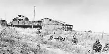 The first units of the North Shore Regiment's "A" and "B" companies touched down on Nan Red at 08:10 in chest-deep water.[74] They were tasked with securing Saint-Aubin and clearing defences in the village.[75] "B" Company landed to find that the Saint-Aubin strong point "appeared not to have been touched" by preliminary naval bombardment.[73] The two assault companies faced a 100 yd (91 m) sprint across open beach in the face of fire from Saint-Aubin. "A" Company suffered the most casualties, incurring many fatalities from beach mines.[76] "B" Company faced stronger opposition at the strong point, yet managed to breach the seawall and barbed wire.[77] The 50 mm antitank gun was still firing and the thick concrete casemates protected it from infantry fire. By 08:10, Sherman tanks of the Fort Garry Horse and AVRE of the 80th Assault Squadron, Royal Engineers, had landed at Nan Red and begun to assist "B" Company in clearing the gun emplacement.[78] The 50 mm gun knocked out four of the squadron's tanks, while the North Shore's machine-gun platoon was flanking the position.[79] The right section of the strong point was eliminated by anti-tank guns and engineers, while the central anti-tank gun was silenced by 230 mm Petard demolition bombs fired from the AVRE.[80] When the North Shore captured the strong point, approximately half the defenders were killed; 48 German soldiers surrendered.[81]