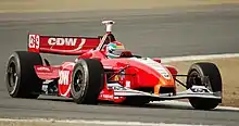 With the loss of employment in F1, Wilson was disenchanted with his career,[59] and sought a drive in the U.S.-based Champ Car World Series (CCWS) over the rival Indy Racing League (IRL) due to its parity, noting: "Same cars, same engines, so working with the team with a half reasonable budget you can do a half decent job."[60] Wilson signed with the small-budget Conquest Racing team for the 2004 season.[61][62] The layout of his Lola car allowed him to lie almost flat on its floor and demonstrated a decent performance in pre-season testing.[63] Wilson had a mixed season driving the No. 34 car; he took eight top-ten finishes, with a year-best of fourth at the season-ending Gran Premio Telmex/Tecate. He generally qualified higher than he finished, taking a season-high of second at the Champ Car Grand Prix of Portland.[64] Wilson finished 11th in the drivers' standings with 188 points,[64] and was second to A. J. Allmendinger in the rookie of the year standings.[65]