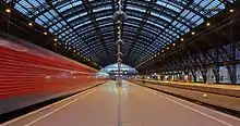Köln Hauptbahnhof or Cologne Central Station[6] is a railway station in Cologne, Germany. The station is an important local, national and international transport hub, with many ICE, Thalys and Intercity trains calling there, as well as regional Regional-Express, RegionalBahn and local S-Bahn trains. EuroNight and Nightjet night services also call at the station. It has frequent connections to Frankfurt by way of the Cologne–Frankfurt high-speed rail line, which starts in southern Cologne. On an average day, about 280,000 travellers frequent the station,[5] making it the fifth busiest station in Germany.[7]