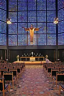 Inside the church, opposite the entrance, a figure of the resurrected Christ is suspended above the altar. This is made from tombak and was designed by Karl Hemmeter. The cross on the altar, by Peter Tauchnitz, is of gilt silver with 37 rock crystals. To the left of the altar is the baptismal font on a stand filled with Carrara marble which contains a majolica bowl for the holy water. To the right of the altar is an octagonal pulpit.[10] Opposite the altar on a gallery is an organ containing about 5,000 pipes, which was built by Karl Schuke. Plexiglas panels have been installed over the organ gallery to improve the acoustics.[11] By the northeast wall of the church are three works of art. The first is a bronze plaque commemorating the Protestant martyrs who died during the Nazi regime between 1933 and 1945. It incorporates a Spanish wooden crucifix dating from the 13th century. The plaque was placed in the church on 20 July 1964, the 20th anniversary of an attempt to assassinate Hitler. Next to this is the Stalingrad Madonna, a symbol of hope and reconciliation. This is a charcoal drawing made by Kurt Reuber during the time he was trapped inside Stalingrad at Christmas 1942. Copies of this drawing have been sent to Coventry Cathedral and the Russian Orthodox Church in Stalingrad (now Volgograd). The third item of art is an icon of the Virgin Mary from Volgograd.[12]